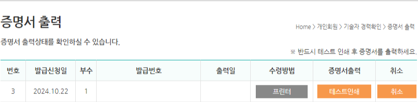 참고로 증명서의 내용은 출력시점에 등록돼있는 경력의 내용이 아닌 발급신청 시의 경력으로 발급된다.