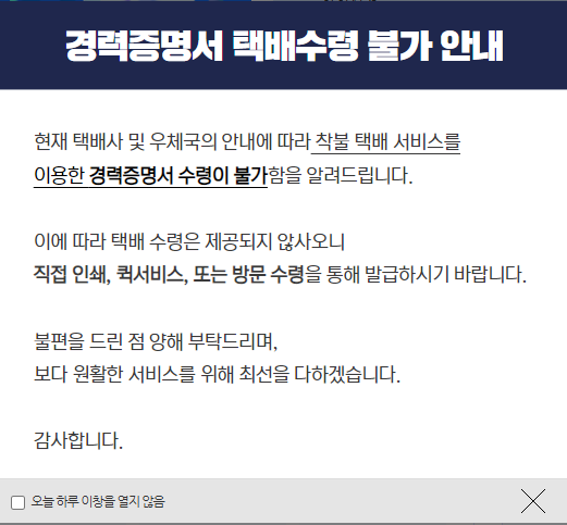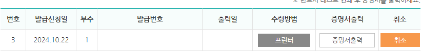 예를 들어 5월에 증명서 발급 신청을 하고 10월에 증명서를 출력하는 경우는 5월 이후에 어떤 경력이 추가 됐는지 상관없이 5월 신청 시점의 등록되어 있었던 내용으로 발급이 되는 것이다.