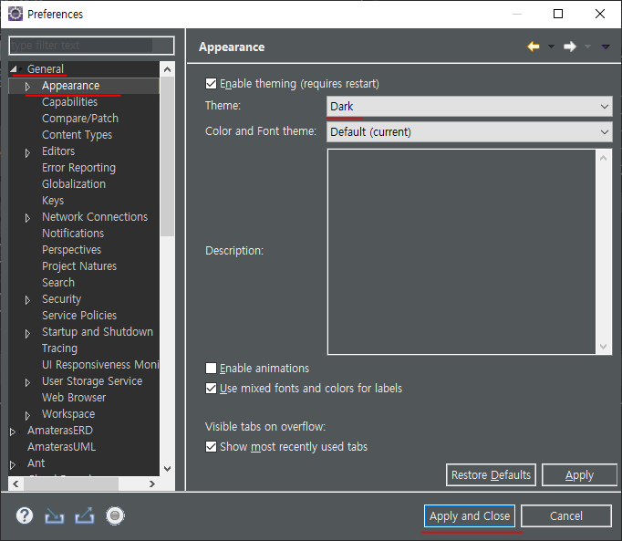 - 「Theme」에서 원하는 테마 선택 후, 「Apply」 또는 「Apply and Close」버튼 클릭