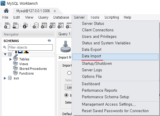 메뉴바의 「Server」 ⇒ 「Data Import」 선택