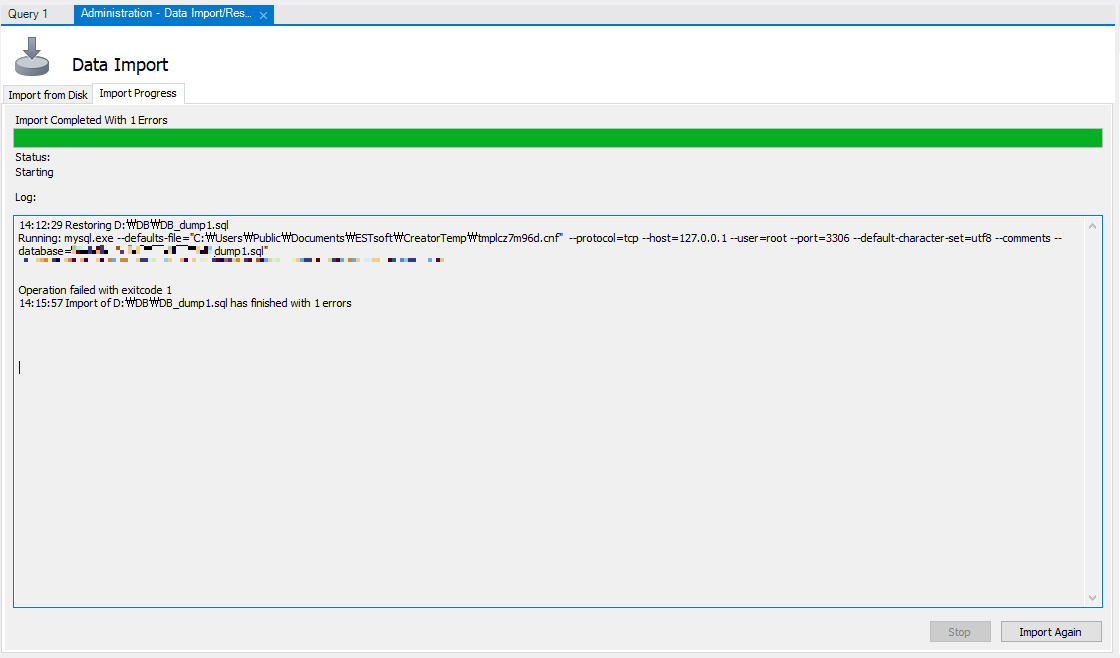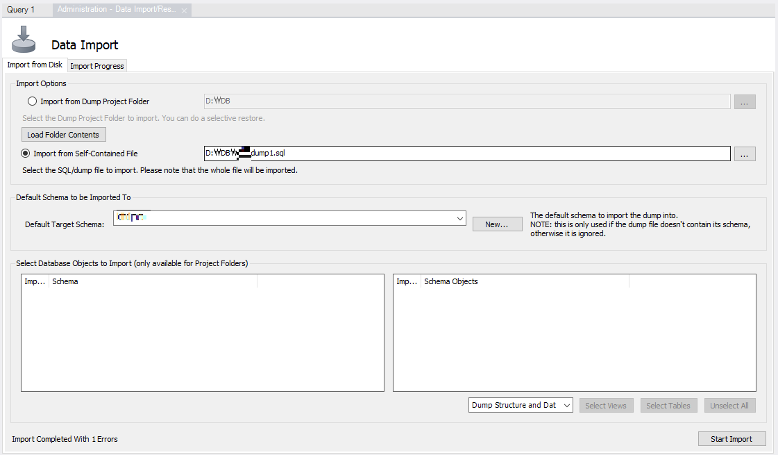 「Default Target Schema」 에서 Import 할 스키마 선택 후 「Start Import」 버튼 클릭