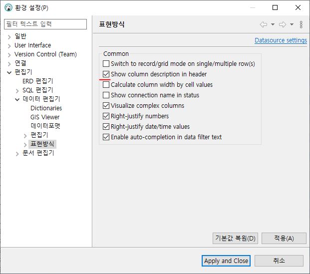 「환경 설정」⇒「편집기」⇒「데이터 편집기」⇒「표현방식」⇒「Show column description in header」 체크 후「적용」또는「Apply and Close」버튼 클릭