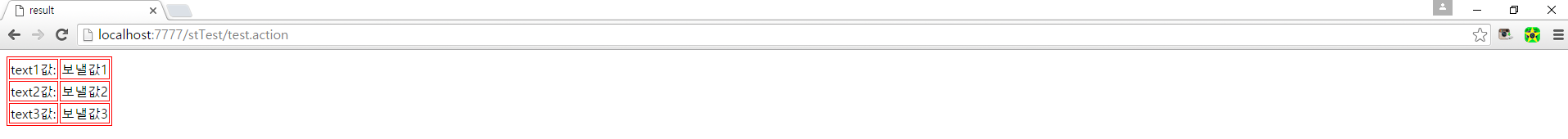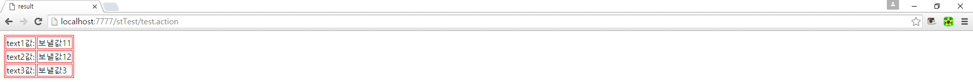 - 최종적으로 test1.jsp의 <s:hidden> 태그에서 보냈던 value값인 "보낼값1", "보낼값2", "보낼값3"이 HTML 테이블에 표시된다.