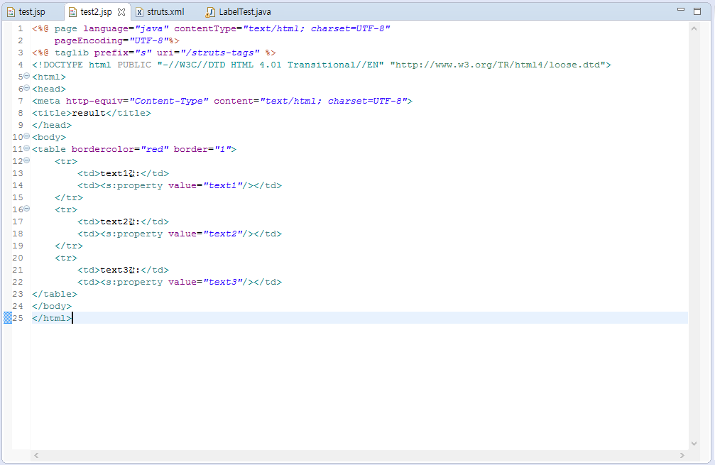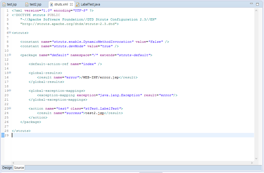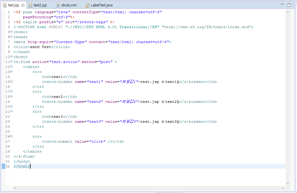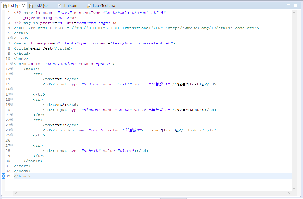 - struts.xml에서 test.action이 호출 시 LabelTest 클래스와 연결.