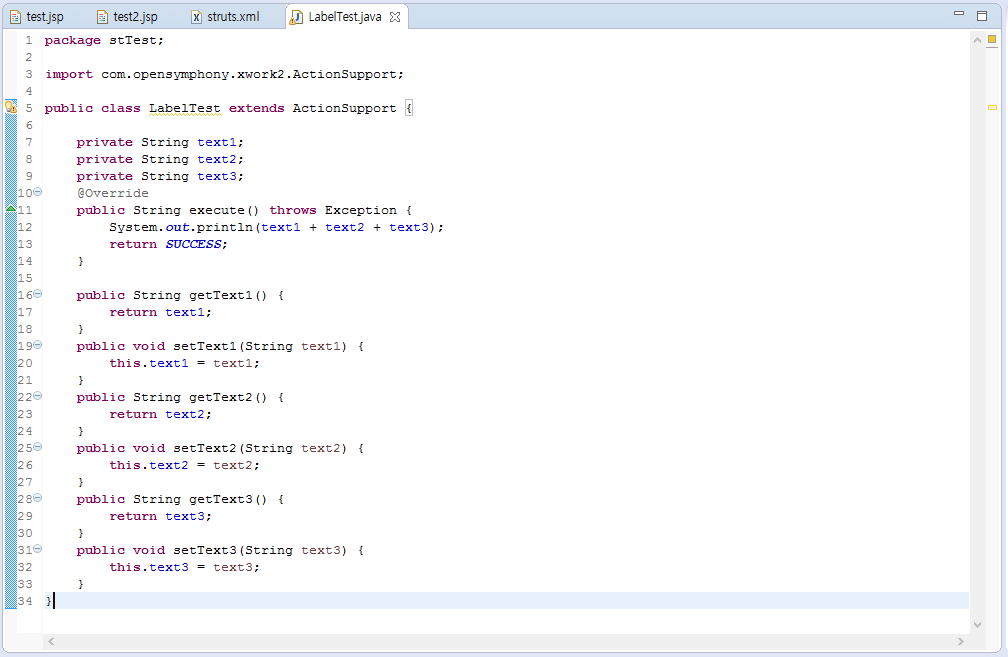 - 변수값이 설정된 후, ActionSupport 클래스에서 상속받은 execute() 메서드가 실행되는데, 여기서 SUCCESS를 반환하면, struts.xml에 정의된 결과 매핑(success)에 따라 test2.jsp로 이동한다.