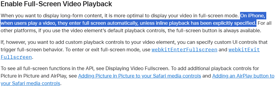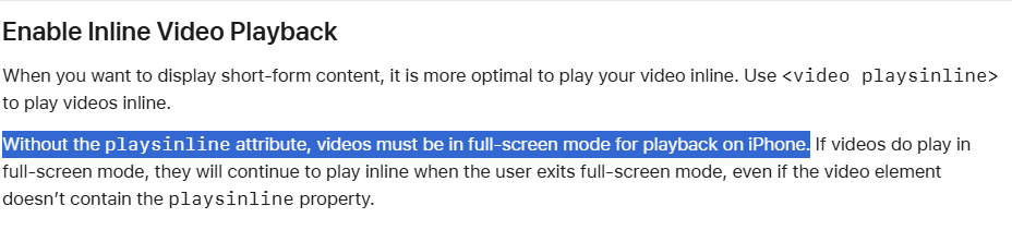 애플 개발자 문서를 살펴봤더니 playsinline 속성이 없는 video는 iPhone(아이폰)에서 전체화면으로 재생된다고 정책상 정해져 있었다.