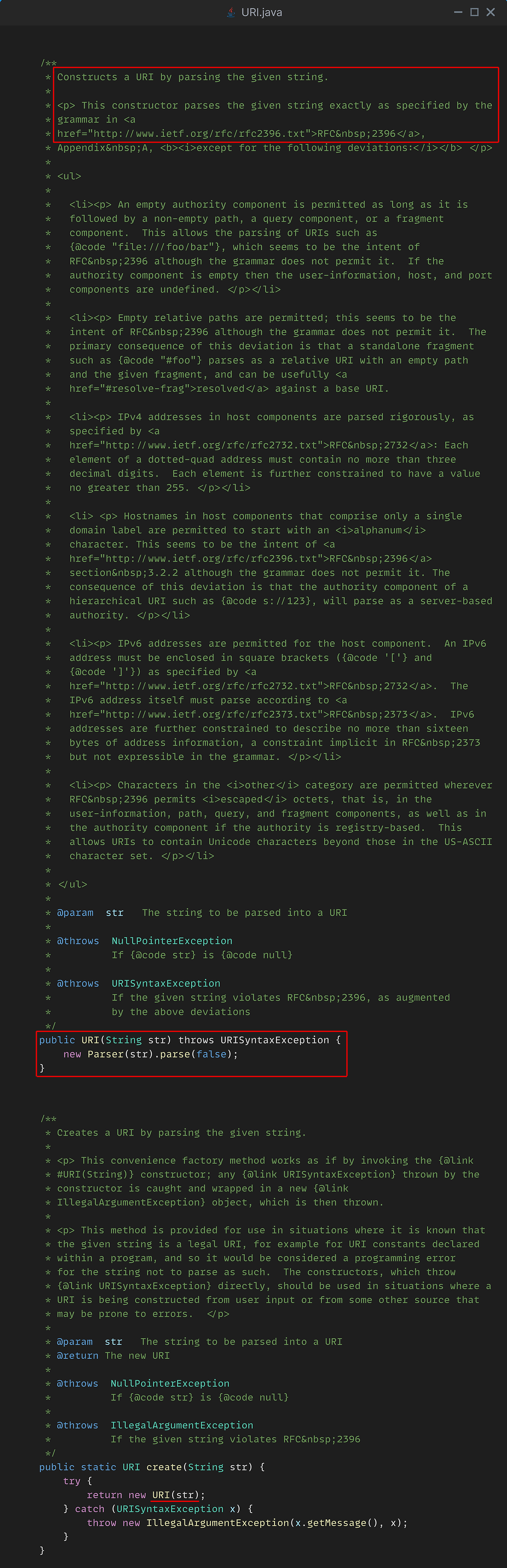 메서드를 따라가 확인해보니 URI.java의 Parser에서 URISyntaxException이 발생하고 있었는데, URI메서드의 JavaDoc 주석을 확인해보니 URI는 반드시 RFC 2396 표준을 따라야 한다고 나와있었다.