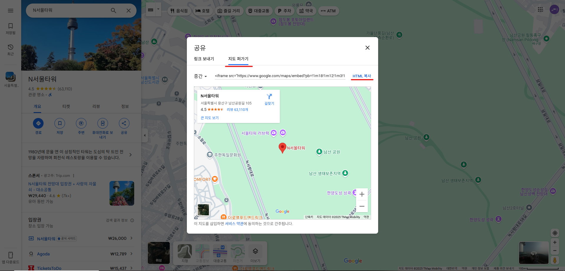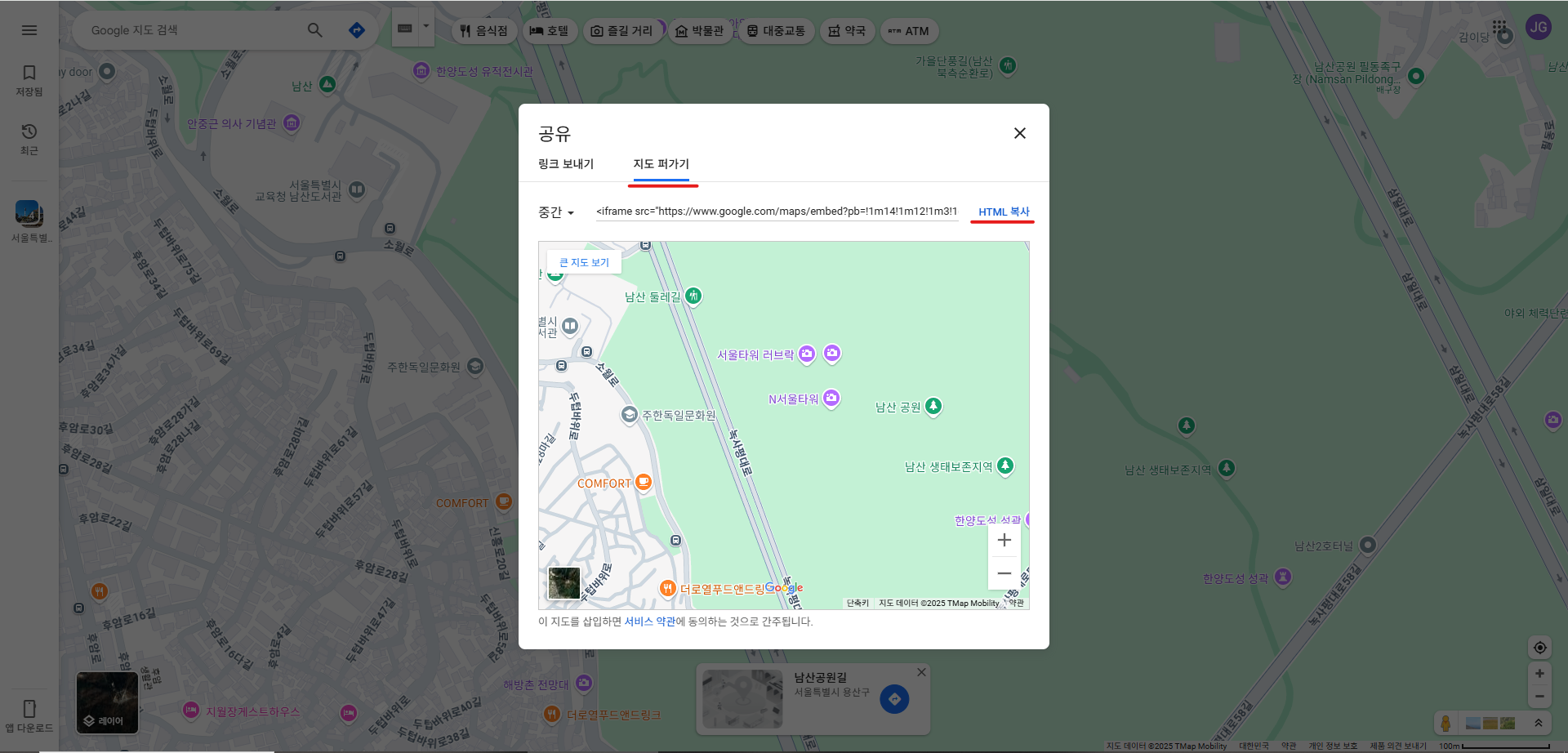 2.「지도 퍼가기」탭 클릭 ⇒「HTML 복사」링크 클릭