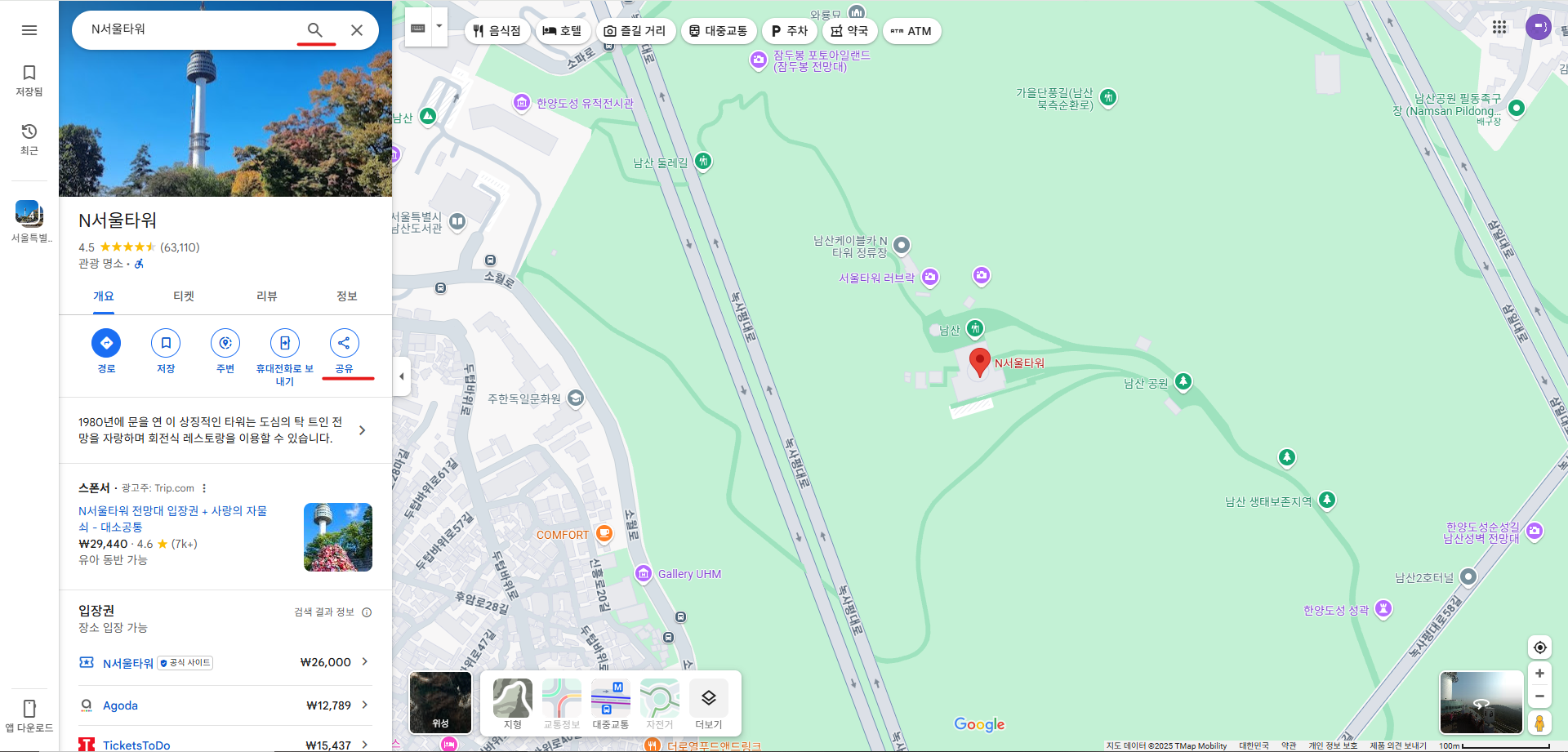 1. 구글지도에 접속 후, 원하는 지역을 검색 ⇒「공유」버튼 클릭