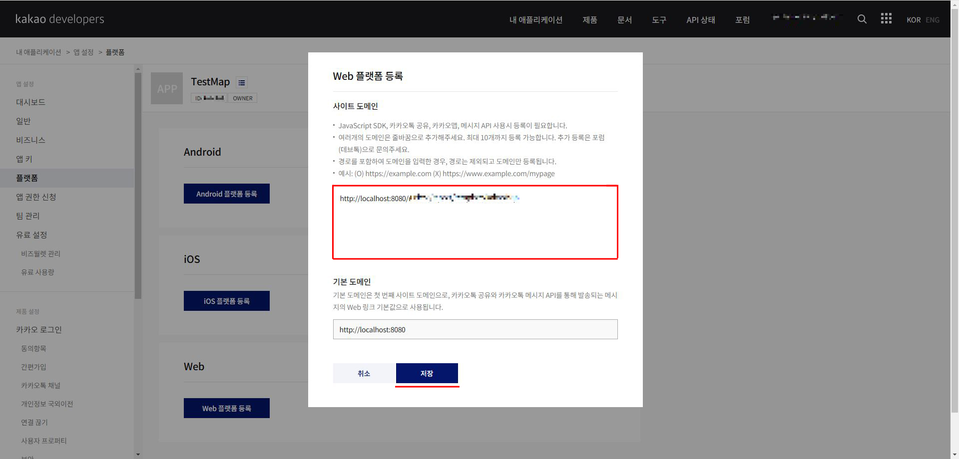 3-4. 카카오지도를 적용할 사이트 도메인을 입력 후 「저장」 버튼 클릭.
