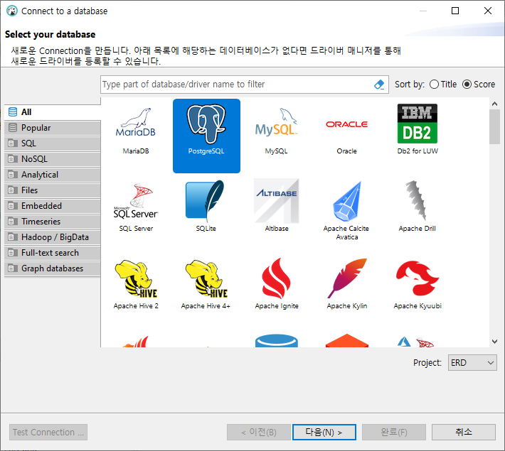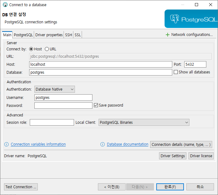 3. 연결 할 DB의 정보 입력 후 ⇒「완료(F)」버튼 클릭