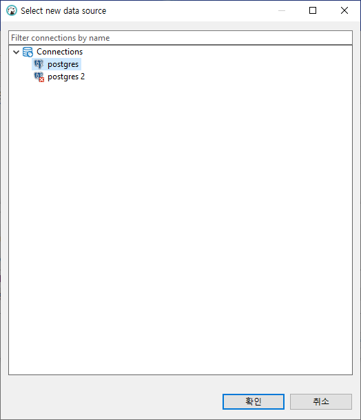새로 연결 할 Connection을 선택 후「확인」버튼을 클릭 (위에서 만든 Connection 또는 기존 Connection을 선택해 주면 된다.)