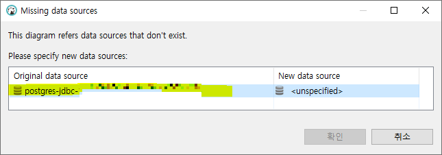 위 오류는 해당 ERD 파일이 참조하고 있는 데이터 소스「ERD 파일 내에 <data-source id="..."> 태그로 정의된 데이터 소스의 ID」가 현재 DBeaver 환경에 존재하지 않기 때문에 발생하는데, 이 문제를 해결하기 위해선 새 데이터 소스를 지정하는 작업이 필요하다.