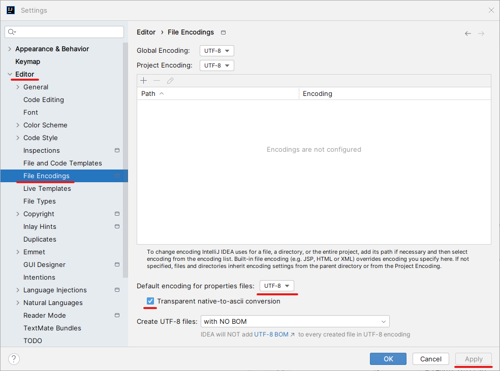 「Editor (에디터)」⇒「File Encodings (파일 인코딩)」⇒