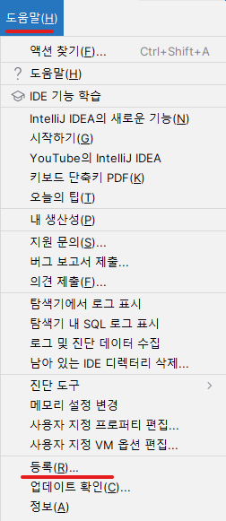 3. 인텔리제이 기동 ⇒ 상단메뉴【도움말 (Help)】⇒【등록 (Register Plugins)】클릭