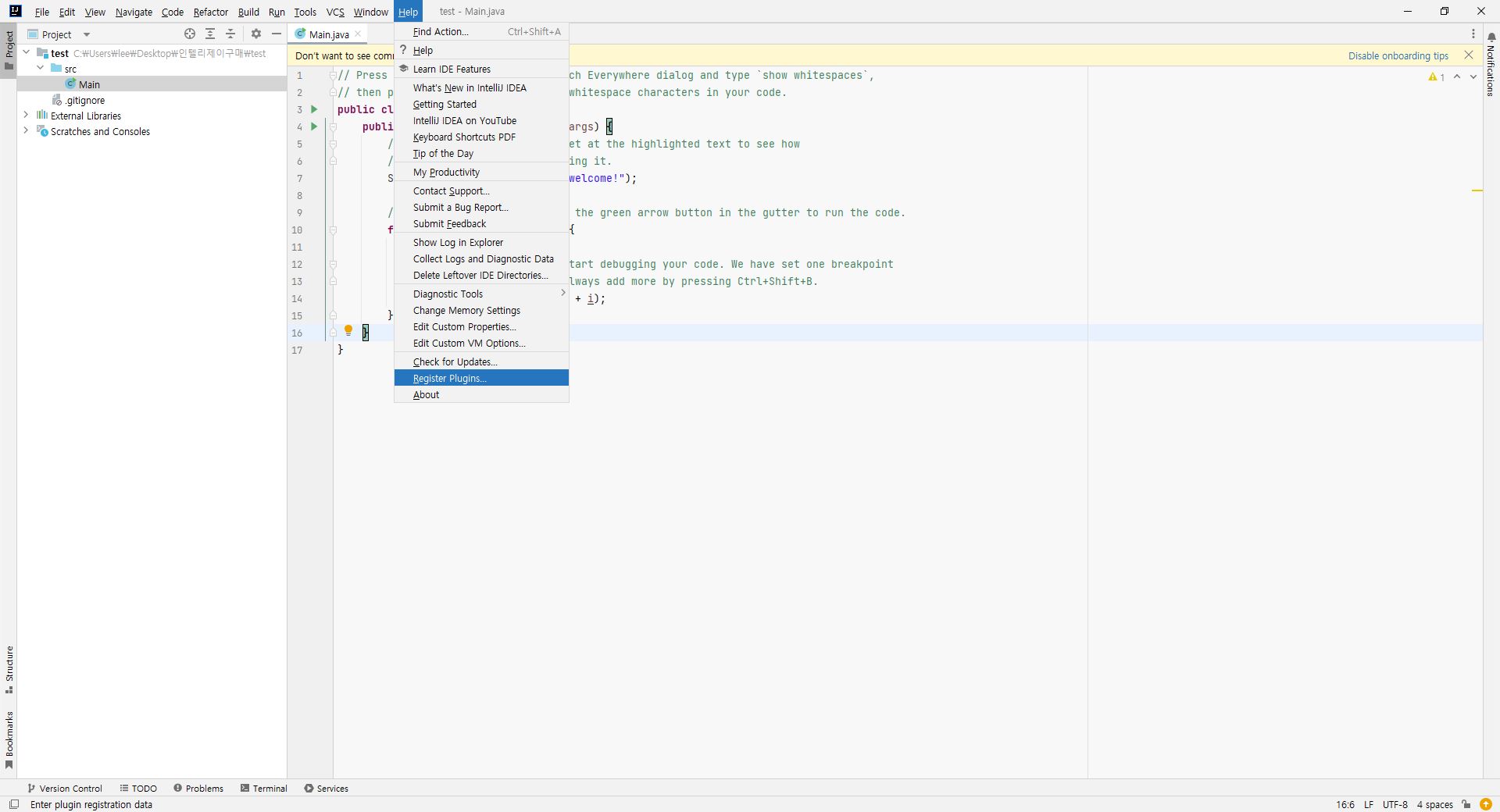 4. 인텔리제이 기동 ⇒ 상단메뉴【도움말 (Help)】⇒【등록 (Register Plugins)】클릭