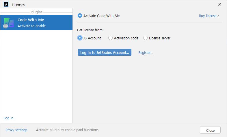 4. JetBrains 계정에【로그인... (Log In to JetBrains Account...)】버튼 클릭 후 로그인 ⇒【새 라이선스 활성화】버튼 클릭