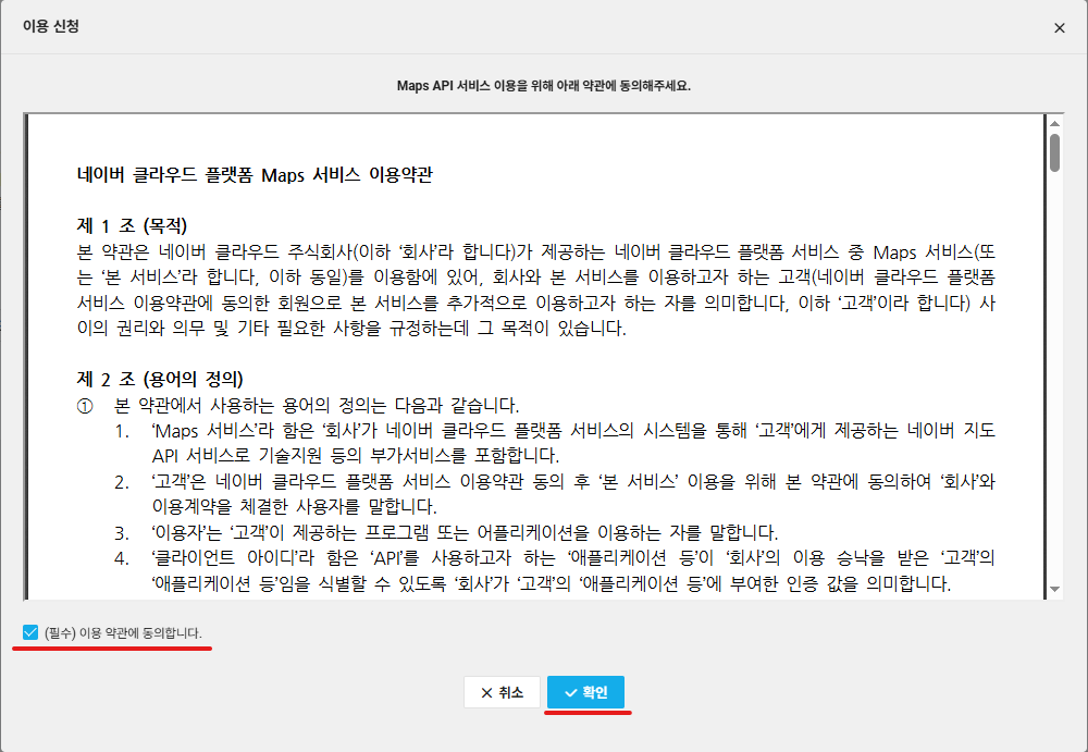 4. 약관 동의 체크 후, 확인 버튼 클릭