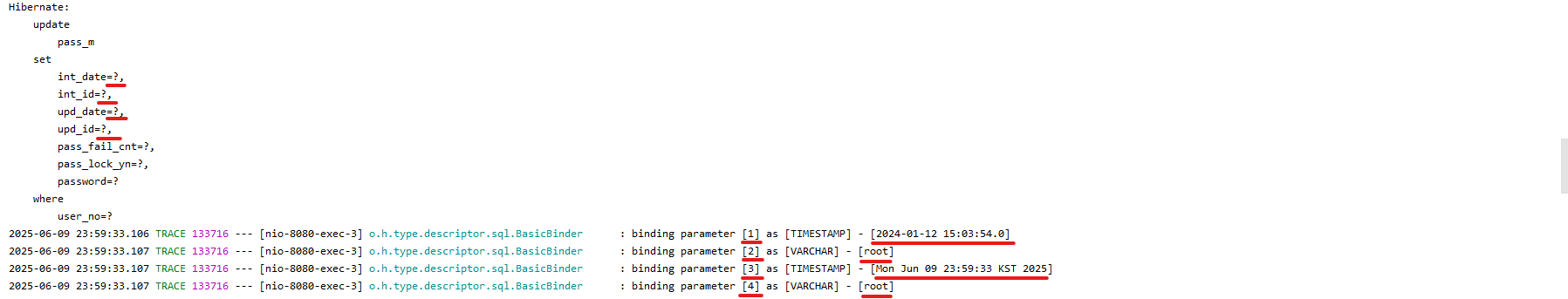 logging.level.org.hibernate.type.descriptor.sql.BasicBinder 로거의 레벨을 TRACE 로 올리면, SQL 실행 전 파라미터 바인딩 정보를 확인할 수 있다.