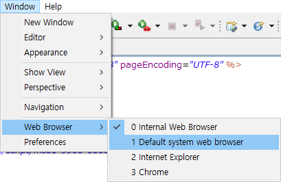 상단메뉴바의 「Window」 ⇒ 「Web Browser」 ⇒ 원하는 웹 브라우저 선택