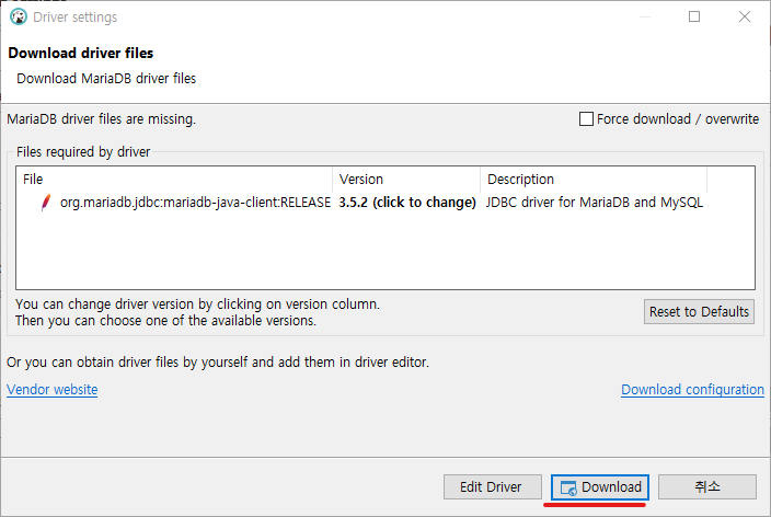 4. MariaDB 드라이버가 없는 경우, "Download" 버튼 클릭