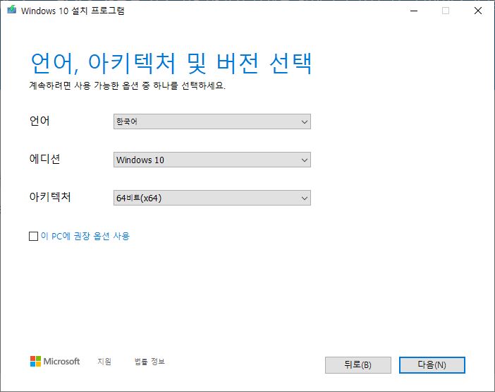 언어, 에디션, 아키텍처 선택 후「다음」버튼 클릭