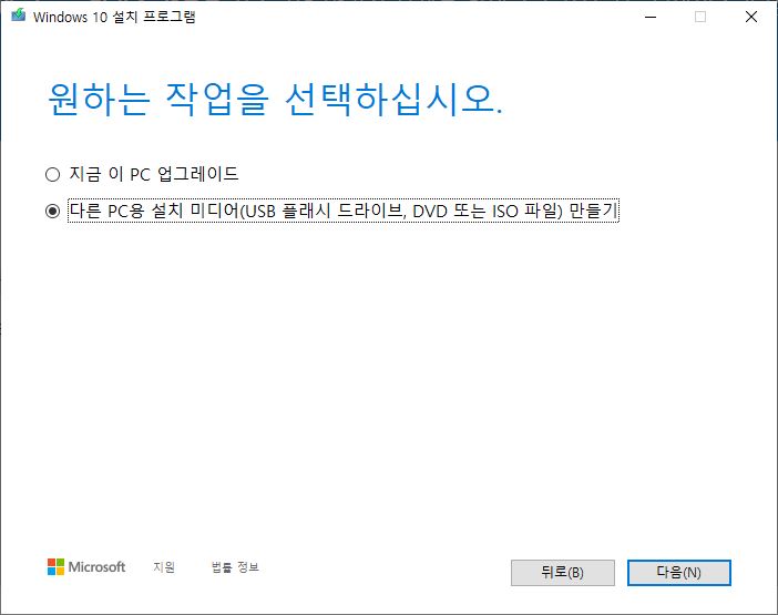 「다른 PC용 설치 미디어(USB 플래시 드라이브, DVD 또는 ISO 파일) 만들기」선택 후「다음」버튼 클릭