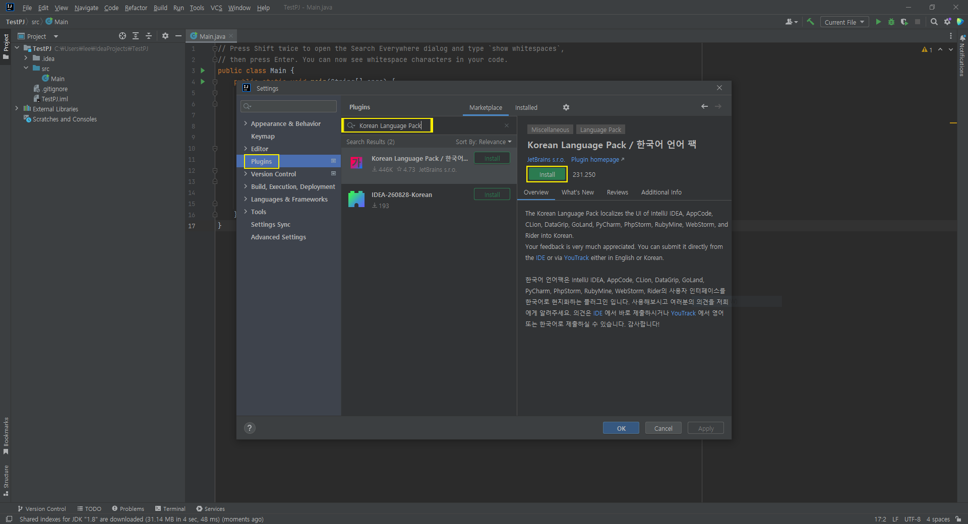 Plugins 검색창에「Korean Language Pack」을 입력하면 한국어 언어 팩이 우측에 나온다.