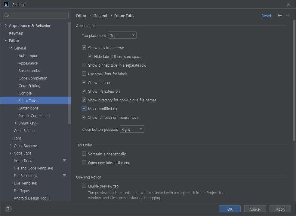 Settings ⇒ Editor ⇒ General ⇒ Editor Tabs ⇒ Appearance 경로의