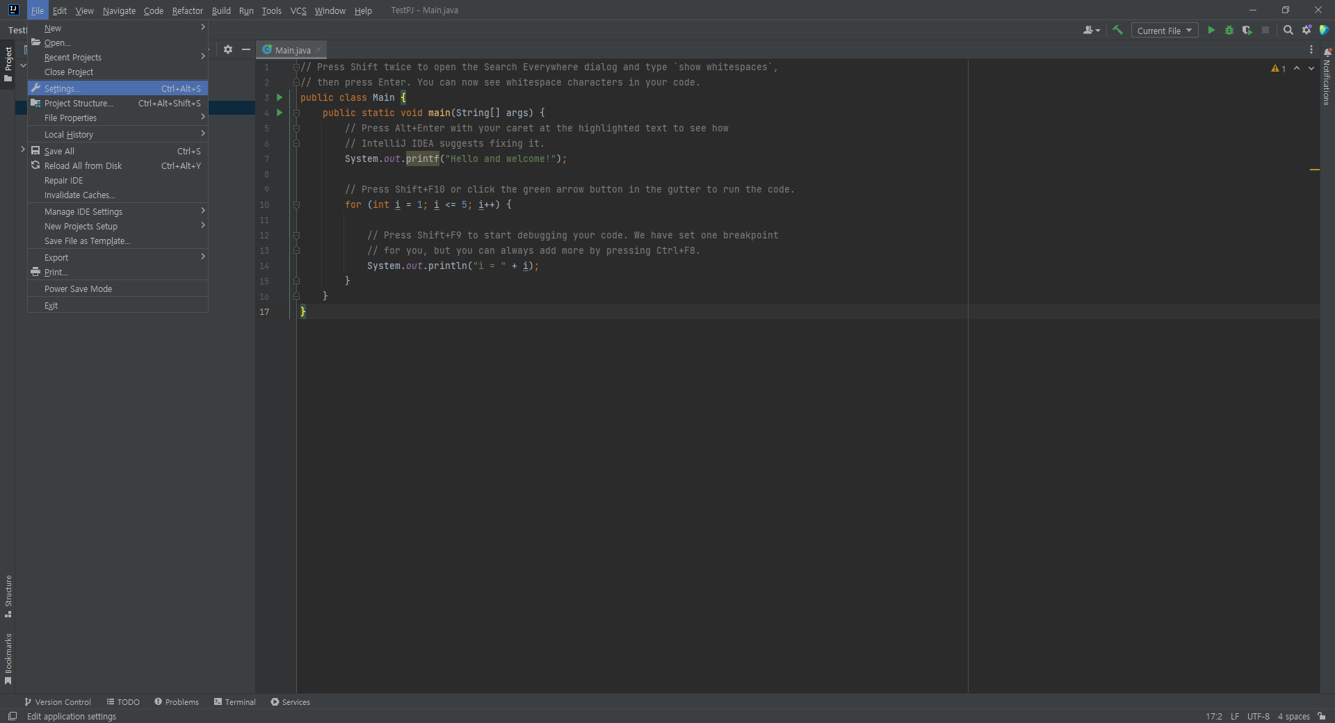 인텔리J 실행 후 Settings 클릭 (Mac의 경우는 Preferences클릭)