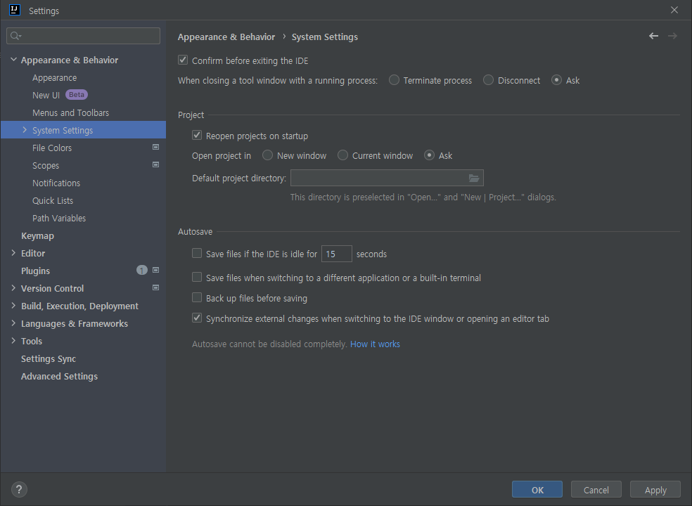 Settings ⇒ Appearance & Behavior ⇒ System Settings ⇒ Autosave 경로의