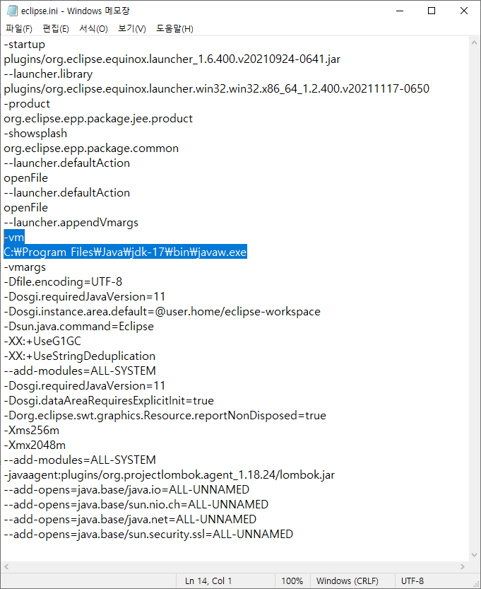 - eclipse.ini에 JDK경로를 추가