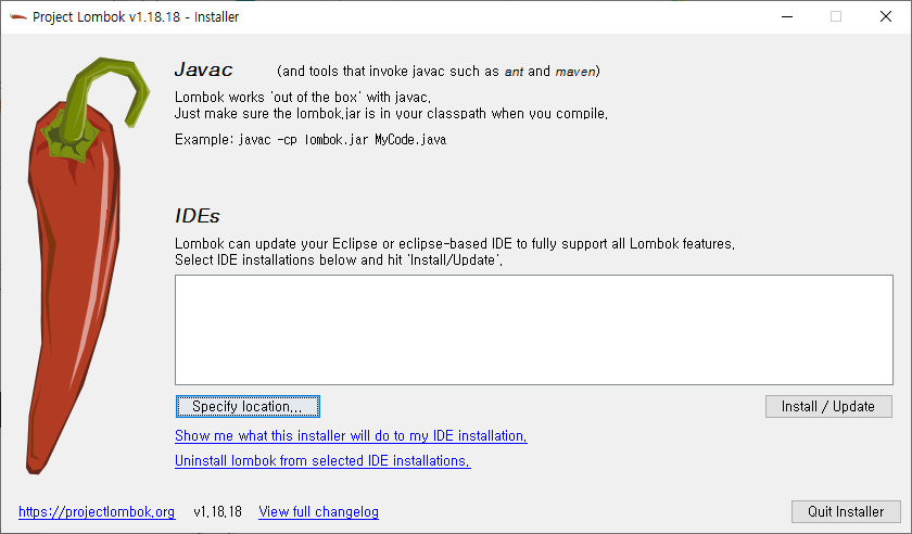 1. Lombok이 설치되있는 경로로 이동해 lombok.jar 파일 실행