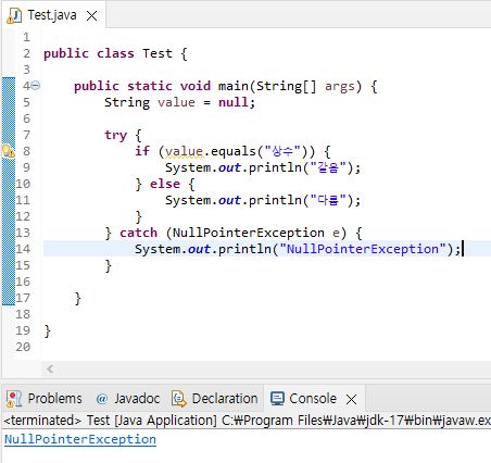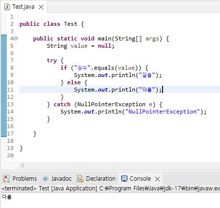 ◆ "상수".equals(변수) 순의 비교인 경우