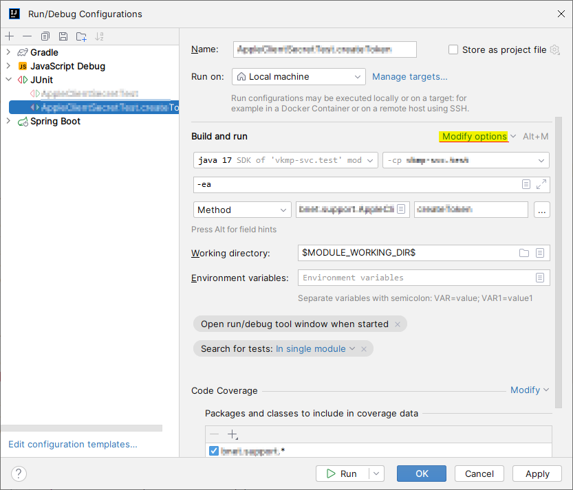 2. Build and run (빌드 및 실행) 영역의「Modify options (옵션 수정)」클릭
