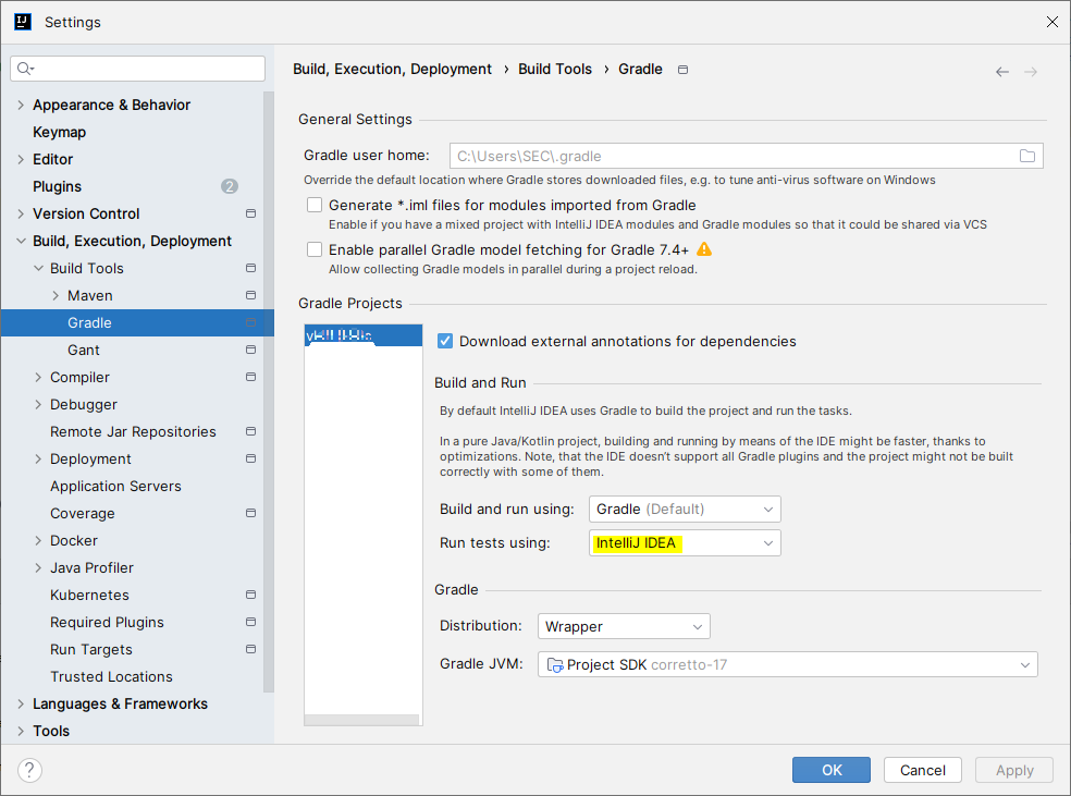3. 「Run tests using:」 ⇒ 「IntelliJ IDEA」 선택 ⇒ 「OK」