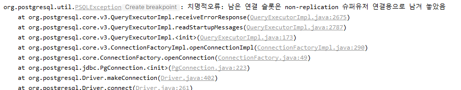 org.postgresql.util.PSQLException: 치명적오류: 남은 연결 슬롯은 non-replication 슈퍼유저 연결용으로 남겨 놓았음