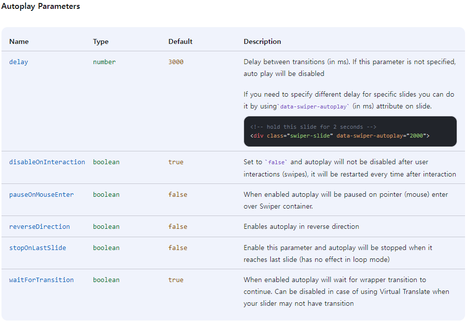 스와이퍼(Swiper)의 API에서 자동재생(Autoplay)에 관한 파라미터가 여러 가지 나오는데 그중에 stopOnLastSlide 옵션을 사용하여 Swiper의 자동재생을 반복할 것인지 한 번만 재생하고 멈출 것인지에 대한 설정을 할 수가 있다.