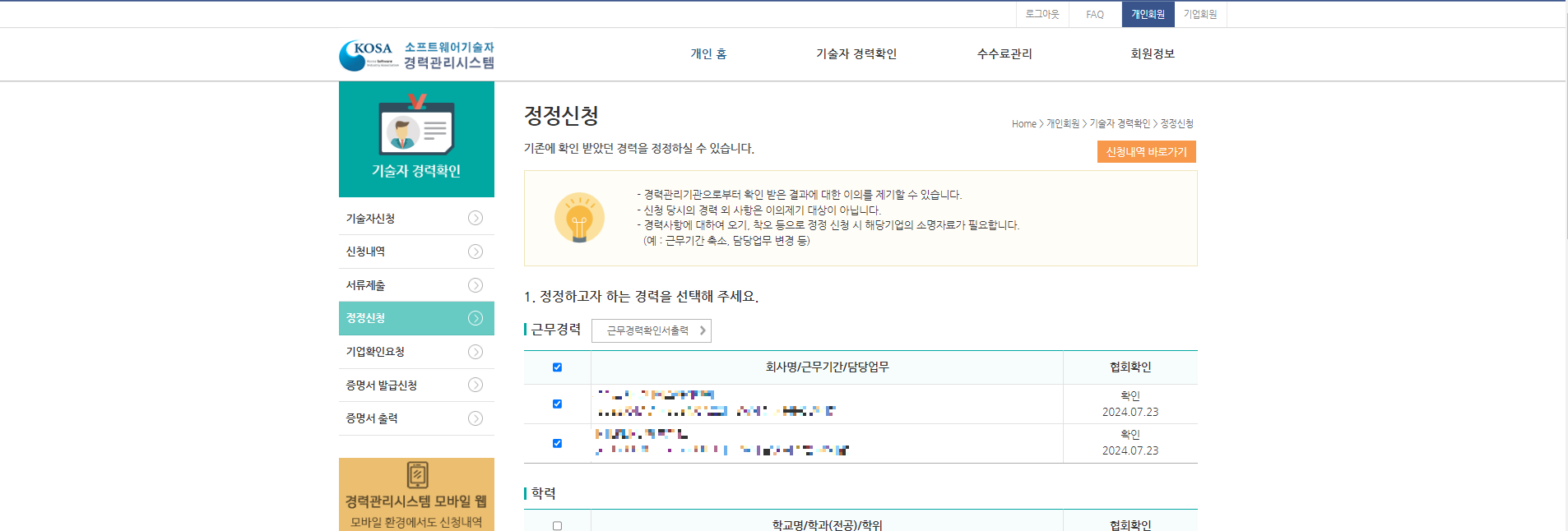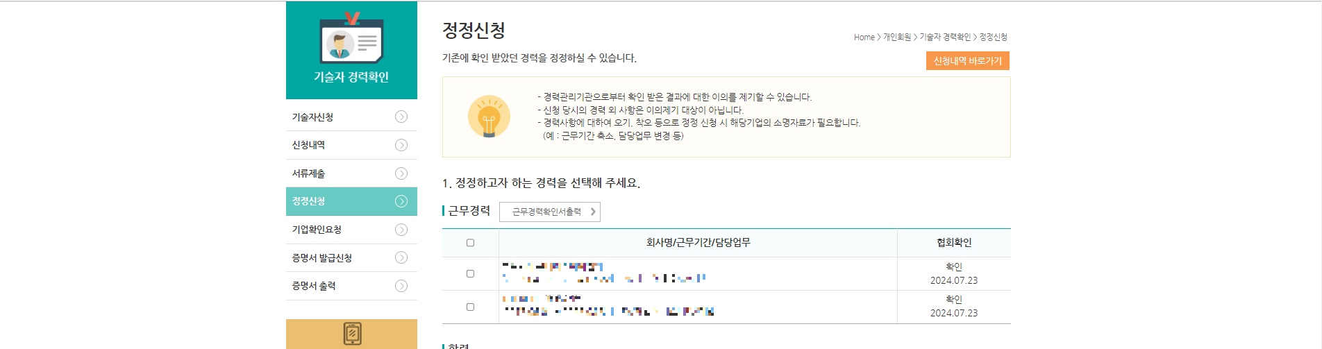 1. 「기술자경력확인」 ⇒ 「정정신청」클릭