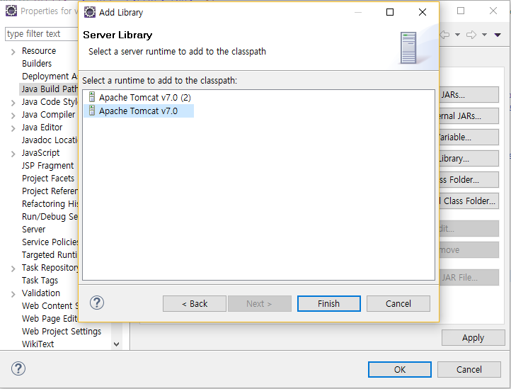 4. 서버 선택 ⇒「Finish」⇒「Apply」⇒「OK」 버튼 클릭