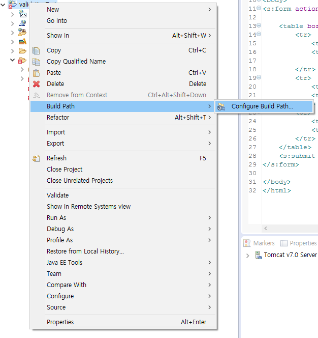 1. 프로젝트에서 마우스 우클릭 ⇒「Build Path」⇒「Configure Build Path...」 클릭