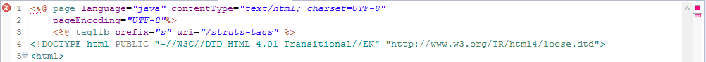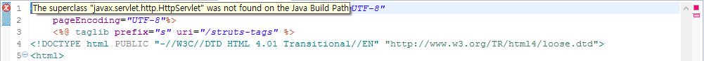 프로젝트 생성 후 jsp파일의 첫 번째 줄에 빨간 Ⓧ마크가 떠있어 마우스를 x마크쪽으로 향해보니