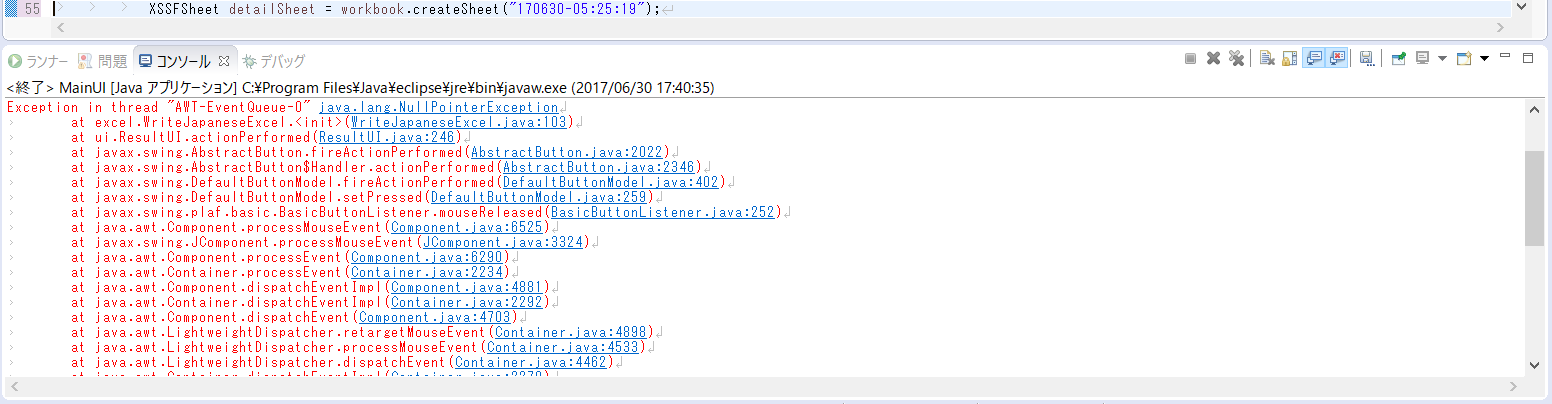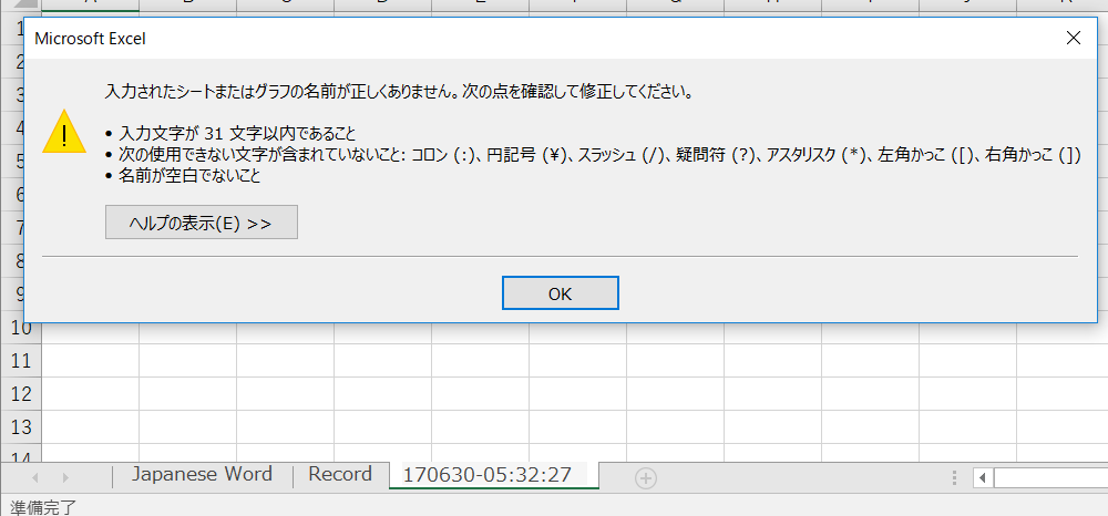 시트명으로 입력했던 170630-05:25:19 중 콜론( : )이 엑셀 시트명에서 금지하는 문자였기 때문에 발생하는 현상이었다.