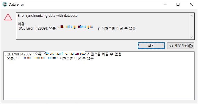 이유: SQL Error [42809]: 오류: "시퀀스명" 시퀀스를 바꿀 수 없음