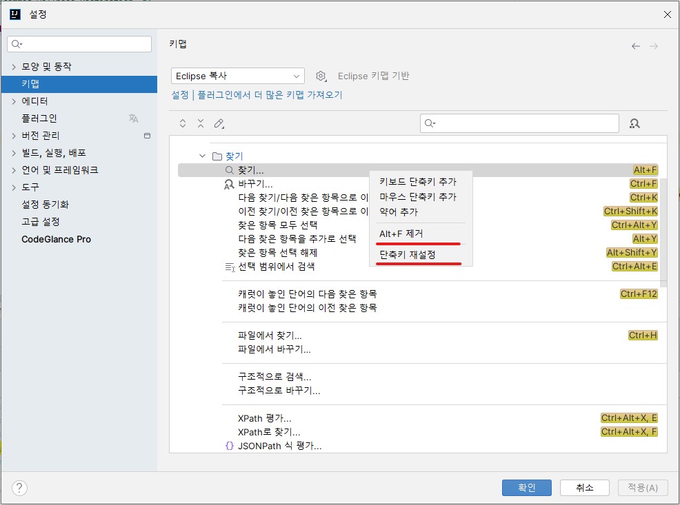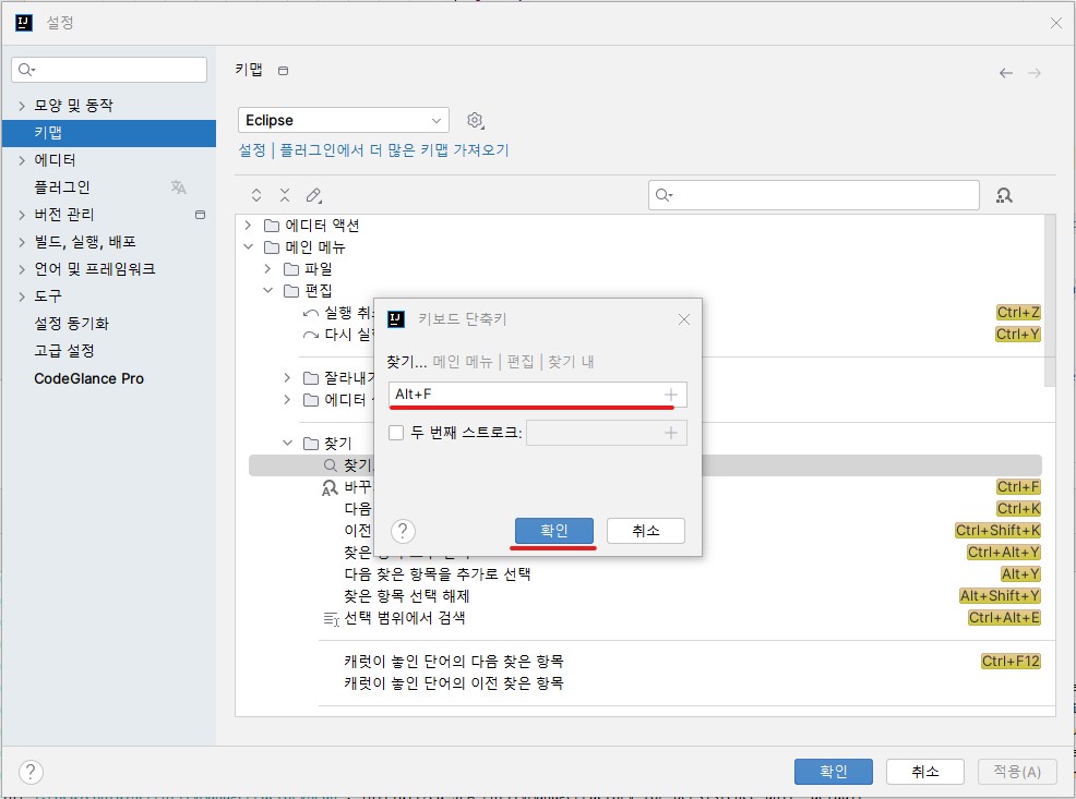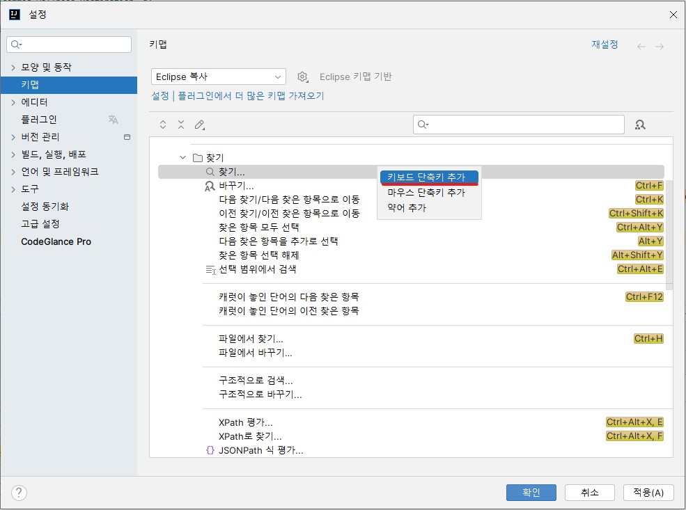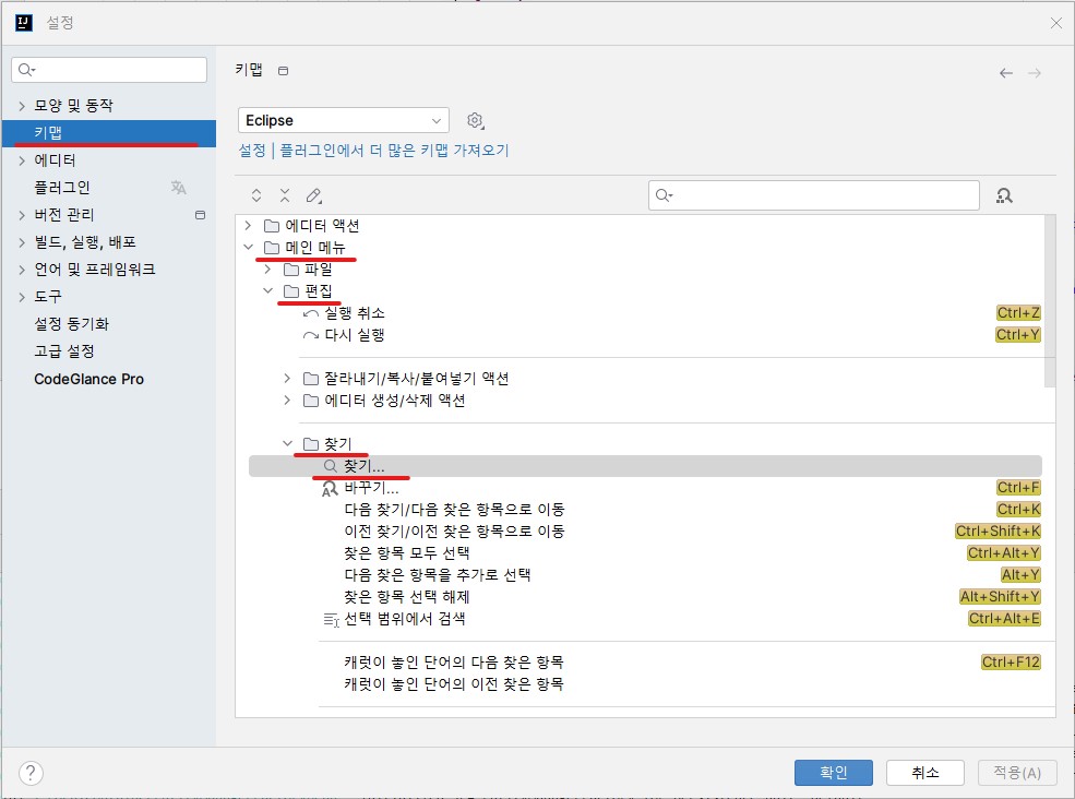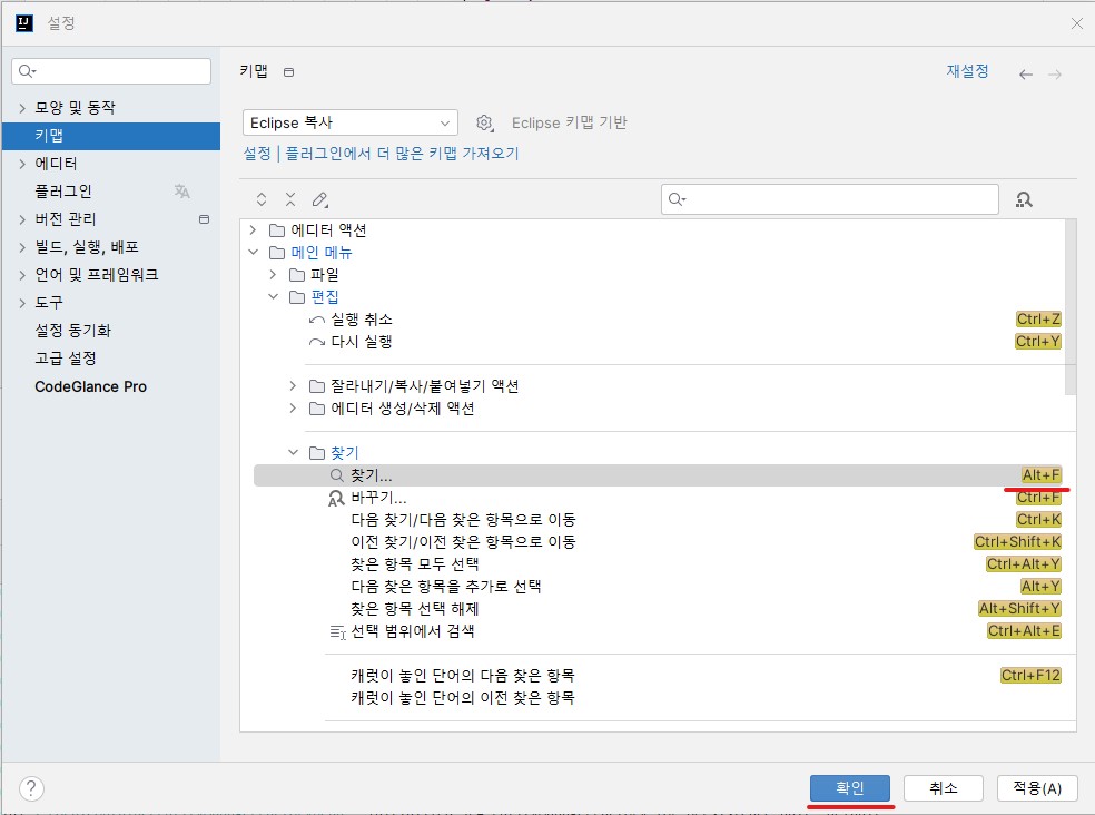 2.「키맵(Keymap)」⇒「메인 메뉴(Main Menu)」⇒「편집(Edit)」⇒「찾기(Find)」⇒「찾기...(Find...)」⇒ 마우스 우클릭 또는 더블클릭