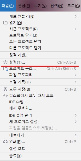 1. 인텔리J 실행 후「파일(File)」⇒「설정(Settings)」클릭 (Mac의 경우는 Preferences클릭)