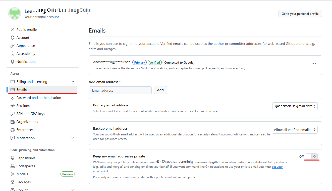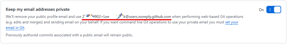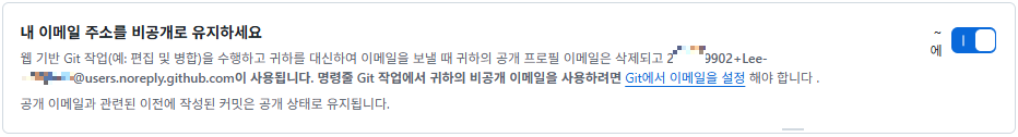 3. Keep my email addresses private에 생성된 이메일을 Git 작성자 이메일(user.email)로 설정